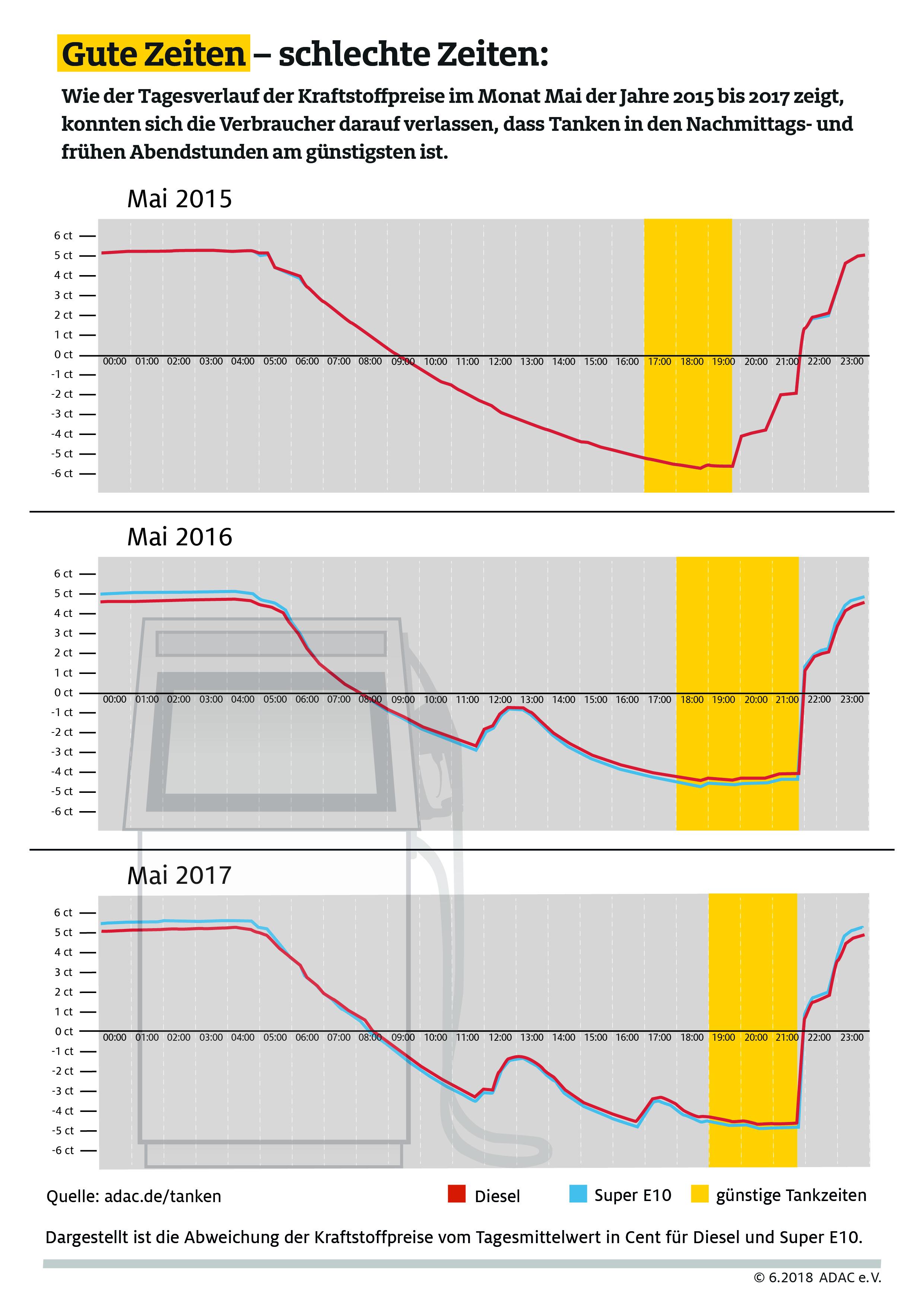 Kraftstoffpreise im Mai der Jahre 2015 bis 2017. Bild: "obs/ADAC/ADAC-Grafik"