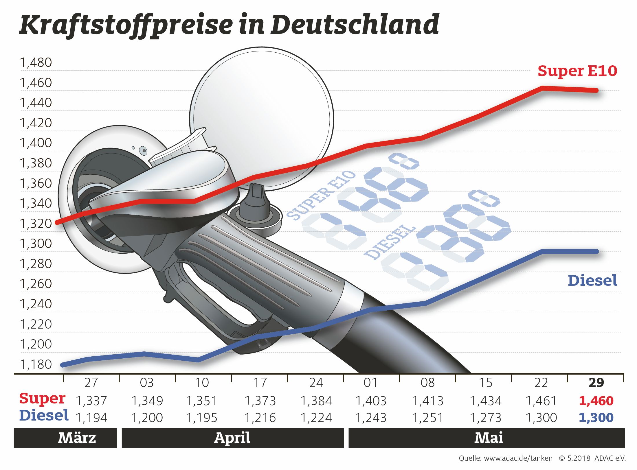 Kraftstoffpreise im Wochenvergleich / Entspannung am Ölmarkt macht sich noch nicht bemerkbar. Bild: "obs/ADAC/ADAC e.V."