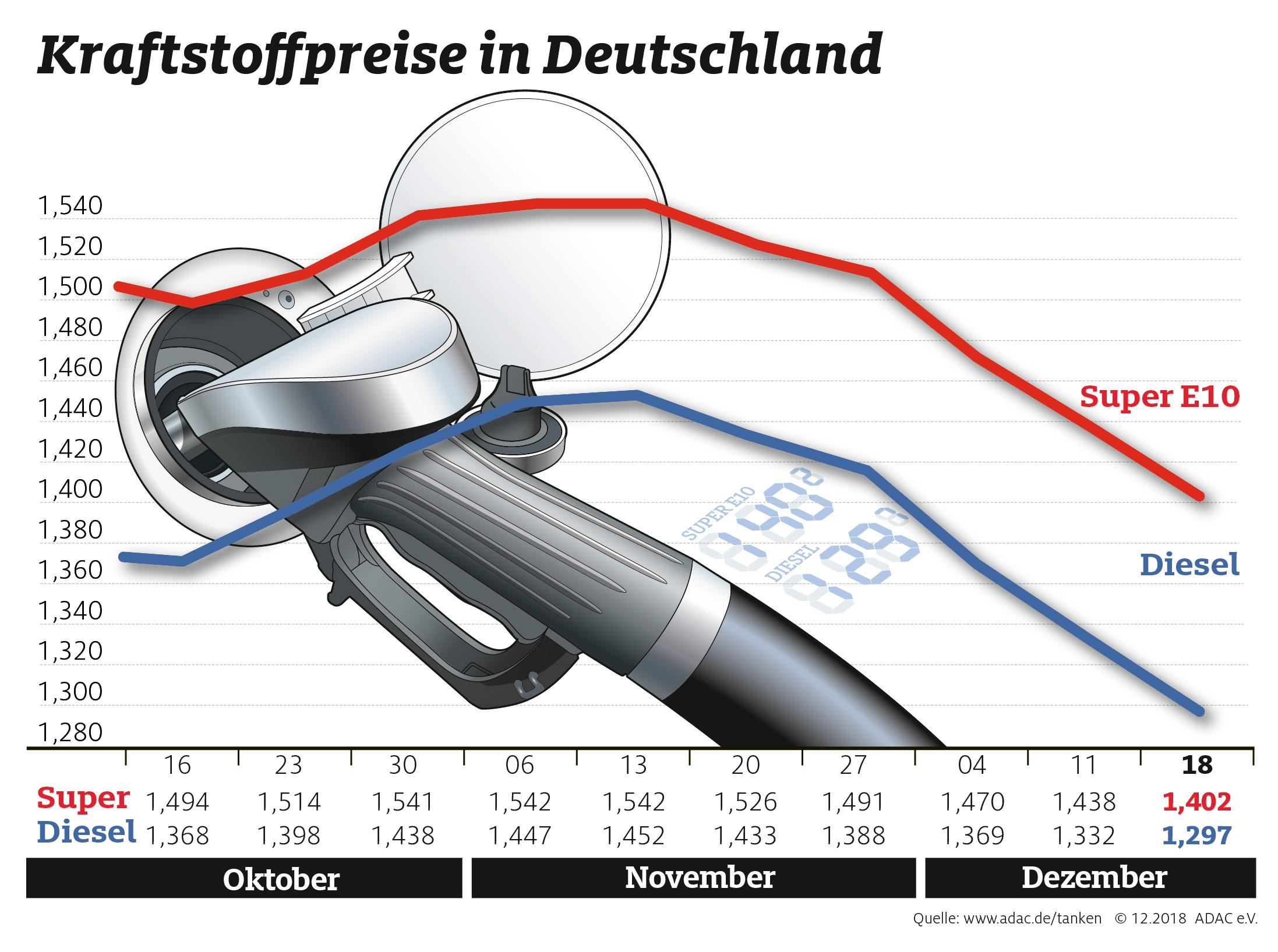 Zurück zu Rückgang der Spritpreise setzt sich fort: Super E10 auf dem Niveau vom Mai