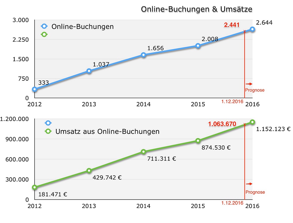 2012 hatte Bad Hindelang Tourismus mit drei online buchbaren Betrieben sein strategisches Ziel „Vertriebsoptimierung Online-Buchbarkeit“ ausgegeben. Seither wurde der Umsatz bei Vermietungsbetrieben aus Online-Buchungen fast versechsfacht. Grafik: Bad Hindelang Tourismus