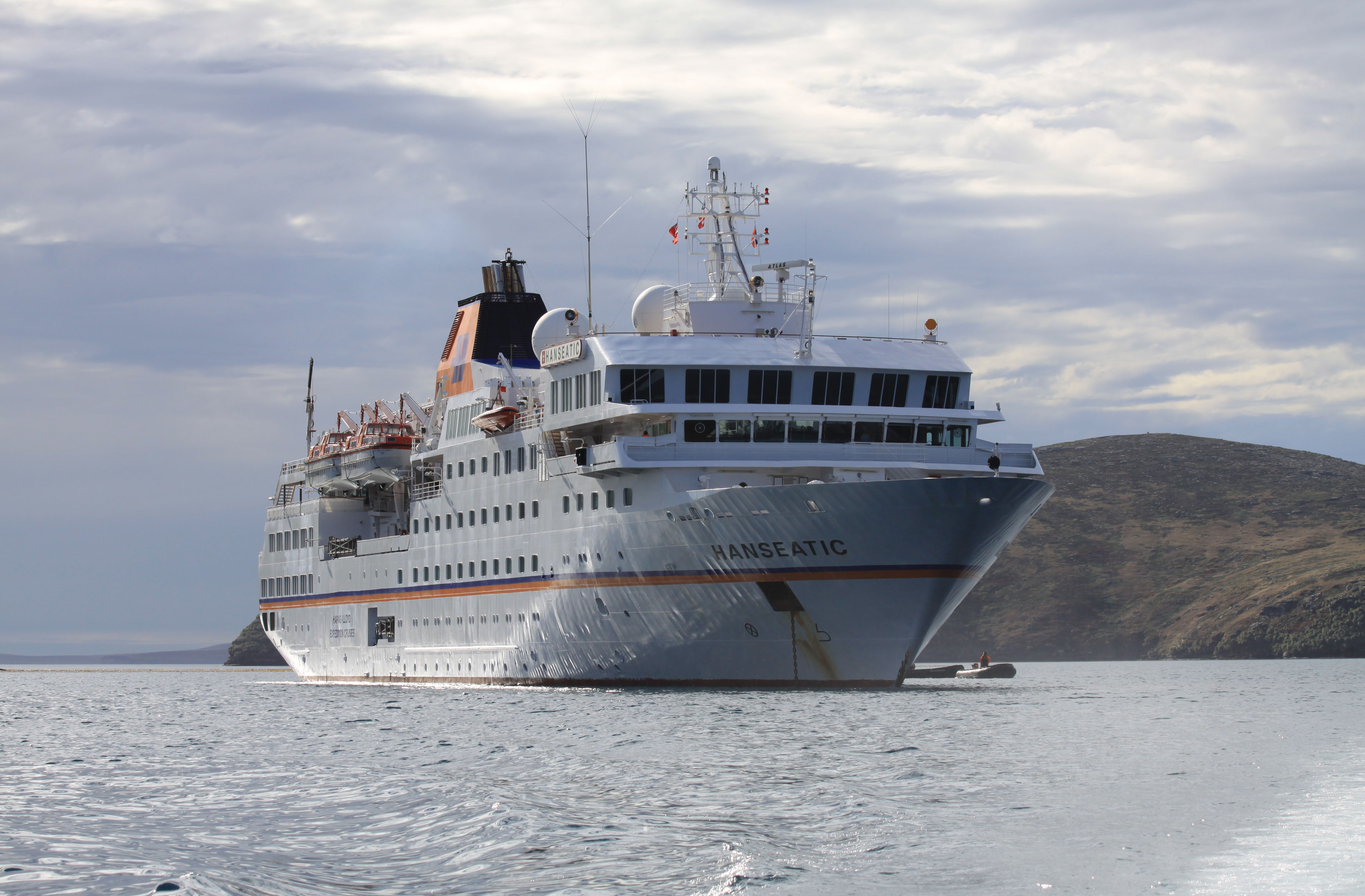 Die Hanseatic vor Anker bei New Island/Falklandinseln