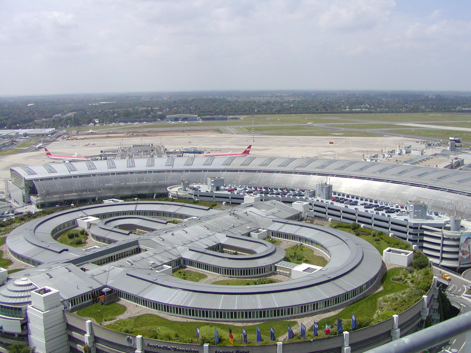 Flughafen Düsseldorf: Blick vom DFS-Kontrollturm auf das Flughafengebäude