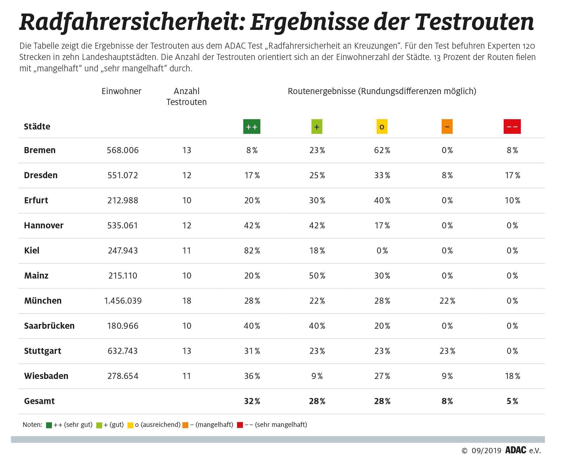 Die Ergebnisse der Testrouten des ADAC Tests "Radfahrersicherheit an Kreuzungen". Weiterer Text über ots und www.presseportal.de/nr/7849 / Die Verwendung dieses Bildes ist für redaktionelle Zwecke honorarfrei. Veröffentlichung bitte unter Quellenangabe: "obs/ADAC"
