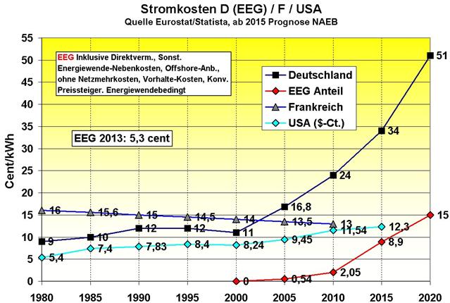Die folgende Tabelle zeigt unsere Einschätzung der Deutschen Entwicklung im Vergleich zu Frankreich und USA. Die rote Kurve stellt die Gestehungskosten für die Energiewenderstromarten dar (heute überwiegend EEG-Kosten)