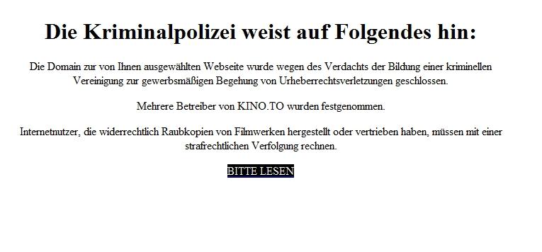 Momentan befindet sich noch die bekannte Warnung der Kriminalpolizei auf der Homepage von "kino.to".