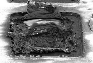 Zerstört: Transistor unter dem Elektronenmikroskop. Bild: caltech.edu