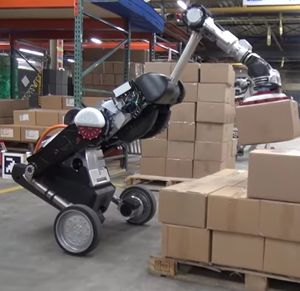 Neuer Laufroboter "Handle 2.0" ergreift einen Karton.