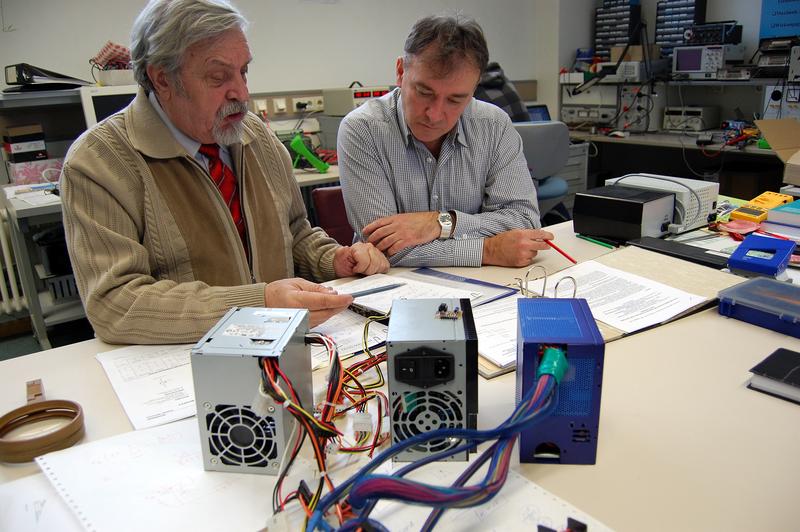Professor Dr. Ewgeni Komarov und Dr. Alexander Kirjuchin (v. l.) haben ein neues, effizientes Netzteil für Personal Computer entwickelt. Im Vordergrund rechts ein Prototyp