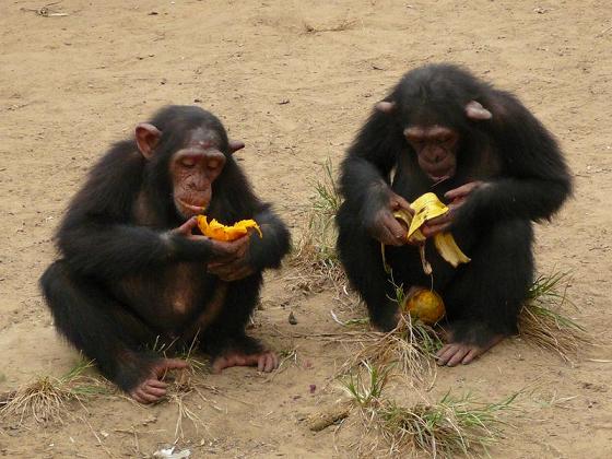 Junge Schimpansen beim Verspeisen ihrer "Beute" nach einer Fütterung. Auch gemeinsam erlangte Ressourcen werden von zwei Schimpansen nur selten geteilt. Bild: Felix Warneken