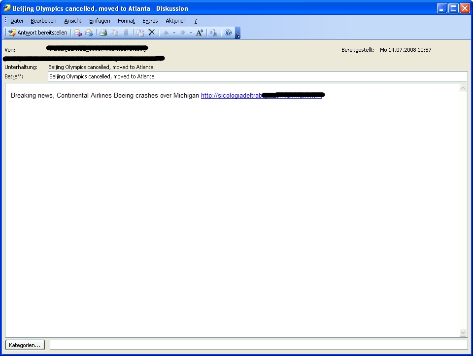 Spam-Mail mit dem Betreff: „Beijing Olympics cancelled, moved to Atlanta“