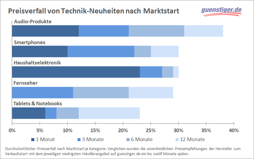 So schnell sind Technik-Neuheiten auf guenstiger.de ein bis zwölf Monate nach ihrem Marktstart im Schnitt im Preis gefallen verglichen mit den jeweiligen Einführungspreisen der Hersteller. Bild: guenstiger.de GmbH Fotograf: guenstiger.de GmbH