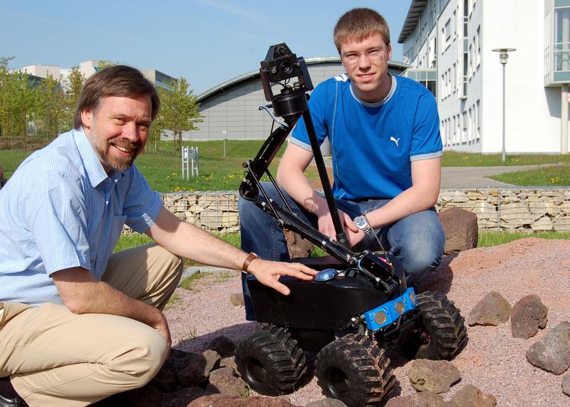 Hoffen auf Erfolg bei der Roboter-Rallye: Professor Klaus Schilling (links) und Daniel Eck mit dem autonomen mobilen Roboter "Outdoor Merlin". Foto: Robert Emmerich