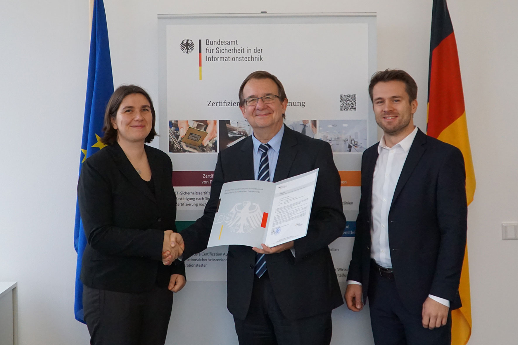 Joachim Weber (Mitte), Fachbereichsleiter Zertifizierung und Standardisierung beim Bundesamt für Sicherheit in der Informationstechnik, übergibt das Zertifikat für die Software "ePassport MRTDAPI" an Manuela Tiedemann und Marco Zamponi von DERMALOG. Bild: "obs/Dermalog Identification Systems GmbH/BSI/Abdelilah Amm"