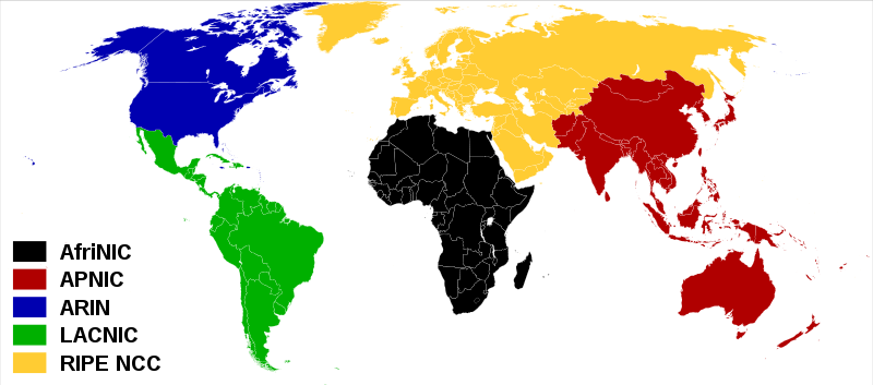 Zuständigkeitsbereiche der fünf RIR (Die Regional Internet Registries vergeben die ihnen von der IANA zugeteilten Netze an lokale Vergabestellen.)