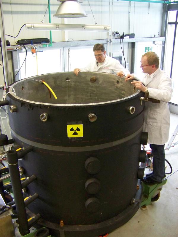 Forscher überprüfen die zwei Kubikmeter großen, mit einem starken Filtersystem ausgestatteten Wassertanks. Quelle: © Fraunhofer IME (idw)