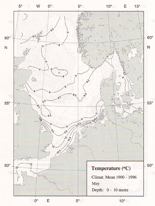 Mittlere Temperaturen der Nordsee Mitte Mai 1900-1966. Quelle: Bundesforschungsanstalt für Fischerei
