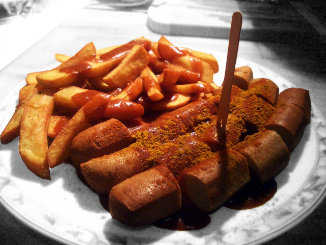 Vegetarisches Currywurst-Imitat mit Pommes frites