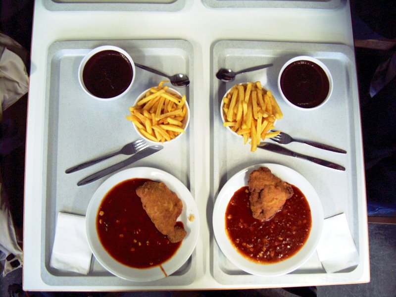 Beispiel: Schnitzel Cordon bleu mit Pommes frites und als Nachspeise Schokoladenpudding (Mensa Stadtmitte, TU Darmstadt)