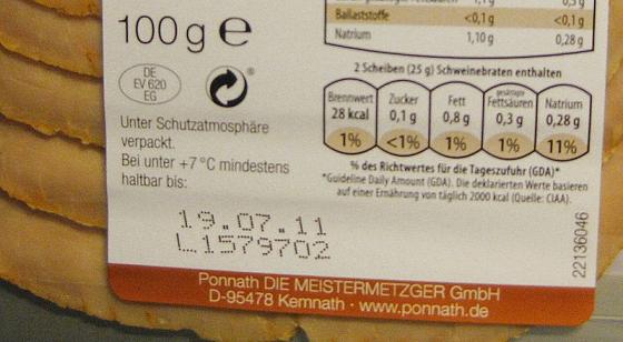 Mindesthaltbarkeitsdatum (MHD) auf dem Etikett einer SB-Packung gegarten Schweinebratens. Bild: Sir James / wikipedia.org