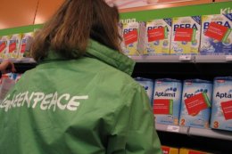 Greenpeace Frankfurt a.M. kennzeichnet Gen- Milchprodukte für Kinder der Hersteller Nestlé und Milupa in drei Filialen von Drogerie- und Supermarktketten. Bild: Greenpeace