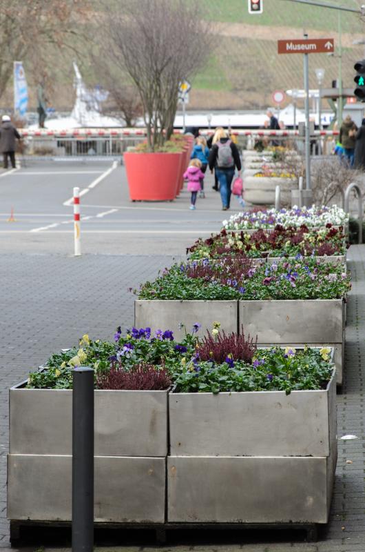 Pflanzkübel an der Bahnschranke – hier in Winterflora - sollen im Frühjahr mit Nutzpflanzen bestückt werden. Quelle: FH Bingen (idw)