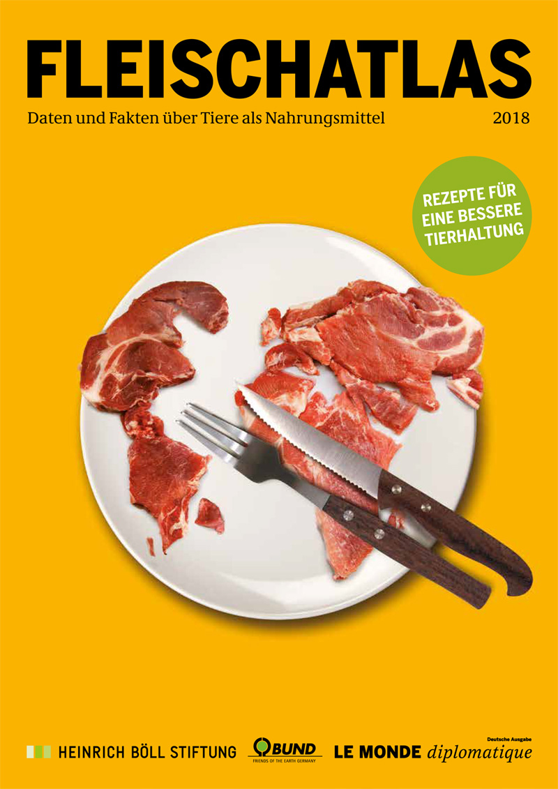 Titelbild Fleischatlas 2018 von BUND, Heinrich-Böll-Stiftung, Le Monde Diplomatique. Bild: "obs/BUND/Art-Direktion Ellen Stockmar"