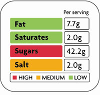 In Großbritannien werden Lebensmittel mit Hilfe der Ampelfarben gekennzeichnet. Die Farben Rot, Gelb und Grün weisen auf den Gehalt an Fett, Zucker und Salz hin.