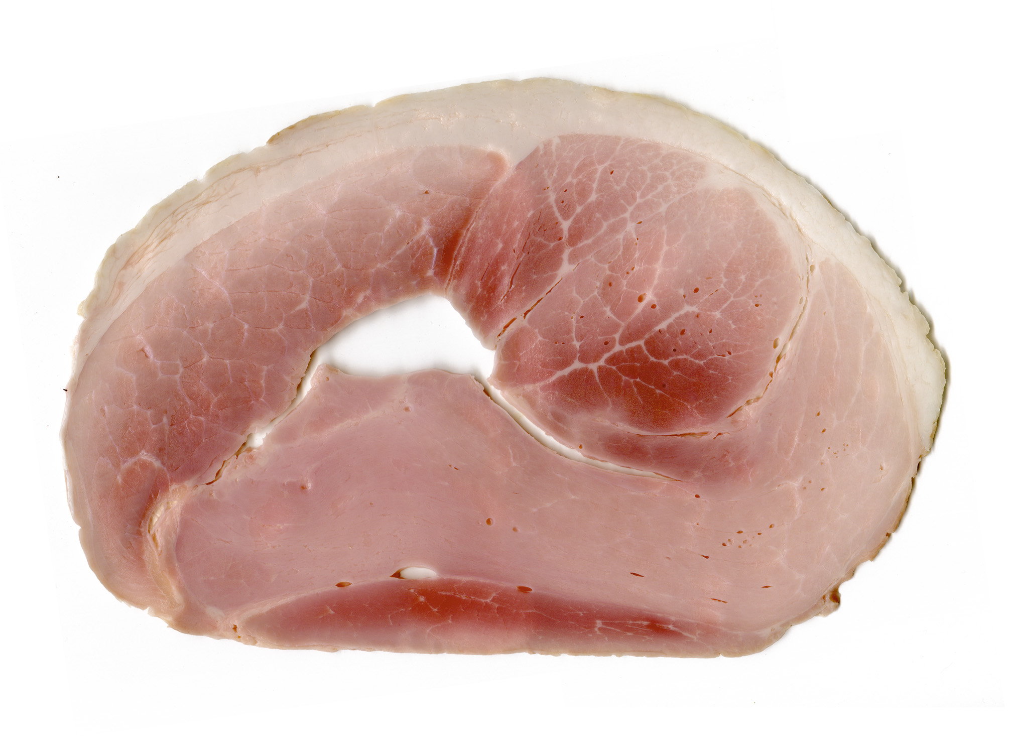 Kochschinken: Die runde Form, ebenso wie die eckige des Rohschinkens, entsteht durch das Pressen des entbeinten Fleisches.
