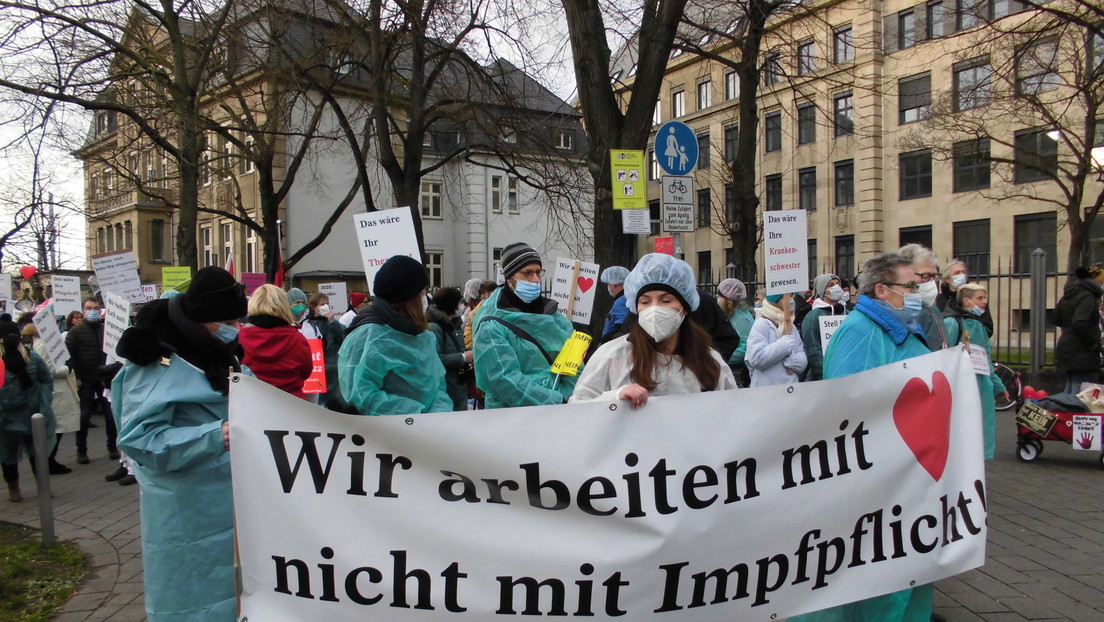 Ein Protestzug der Ärzte und Pfleger in Düsseldorf im Februar 2022 gegen die Impfpflicht im medizinischen Bereich
