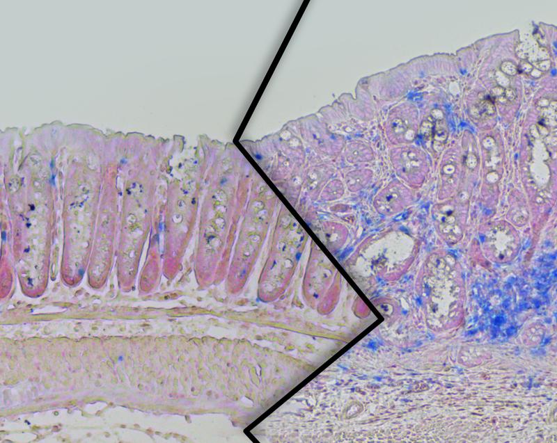 Dickdarmgewebe aus schlanken (links) und übergewichtigen (rechts) Mäusen der Studie. Bei den übergewichtigen Tieren ist ein verstärktes Tumorwachstum mit erhöhter Immunzellanzahl (blau) zu sehen.