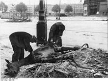 Noch ehe der Kampf verstummt ist, wagen sich hungrige Berliner, hier in Tempelhof, Manfred-von-Richthofen-Straße am späteren Platz der Luftbrücke vor dem Flughafengelände, aus den Kellern hervor, um gefallene Pferde zu zerlegen. Bild: Deutsches Bundesarchiv (German Federal Archive), Bild 183-R77871