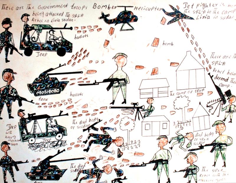 Gezeichnete Kriegserinnerungen eines Jugendlichen aus dem Sudan. Quelle: Foto: Verena Ertl (idw)