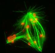 Abnormale mitotische Spindel, für deren Deformation eine defekte Zellteilungskontrolle verantwortlich ist. Die Chromosomen sind rot, die Mikrotubuli grün gefärbt. Bild: Max-Planck-Institut für molekulare Genetik