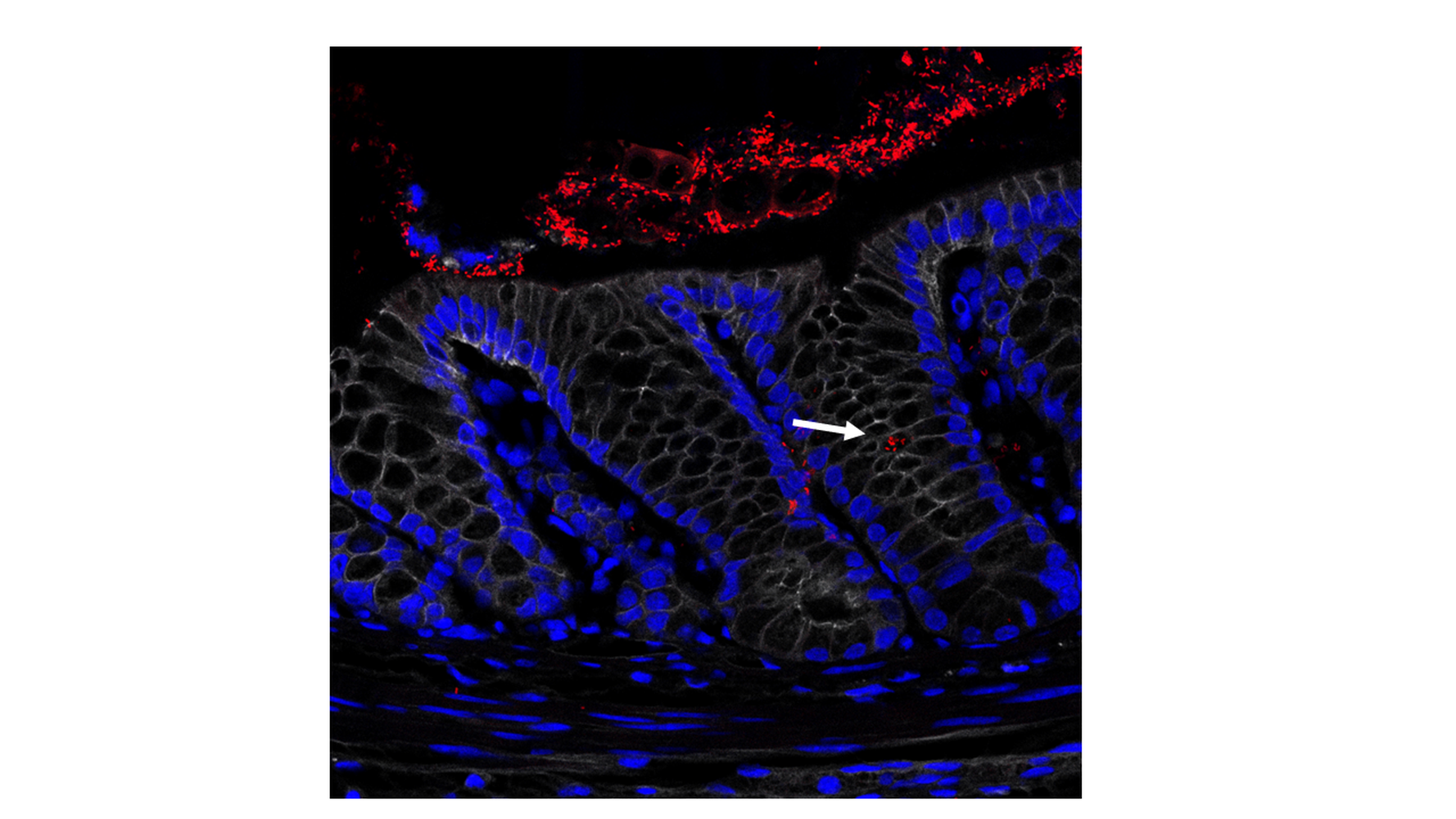 Entzündeter Dickdarm: Zellkerne in blau, Zellmembranen in weiß. In rot die Bakterien, die das gesamte Mikrobiom darstellen. Der Pfeil zeigt auf die Bakterien, die in die Krypten gelangt sind.
