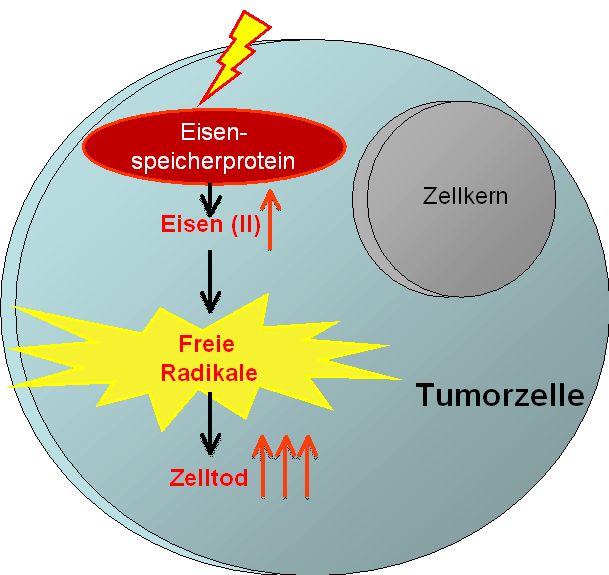 Schematische Darstellung einer Tumorzelle. Eine Freisetzung von Eisen-Ionen (Fe2+) führt in einer Tumorzelle zu einem dramatischen Anstieg an Sauerstoff-Radikalen (gelb). Dadurch entsteht ein oxidativer Stress, der die Zelle in den Tod treibt. Quelle: AG Dr. K. Gülow/Prof. H. Krammer