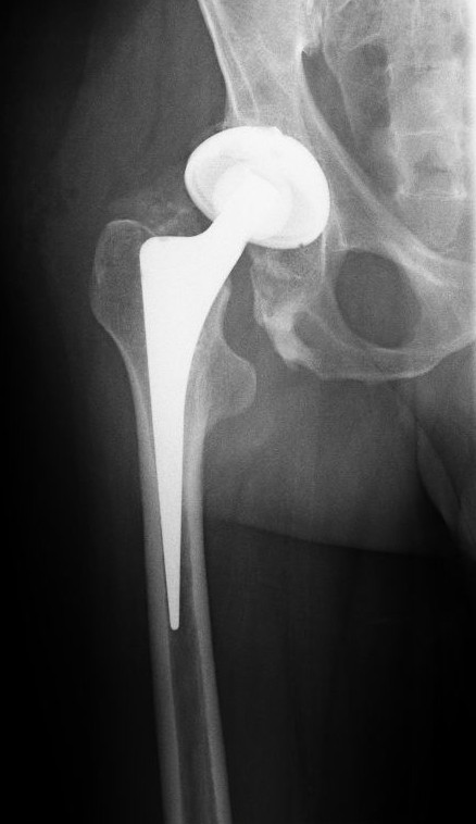 Röntgenbild einer konventionellen, zementfrei eingesetzten Endoprothese des Hüftgelenkes (Abkürzung: HTP oder H-TEP). Das große Metallimplantat erscheint auf der Aufnahme fast weiß, stellenweise durchscheinend. Die künstliche Pfanne ist aus relativ dünnem Material und mit einem Polyethylen-Lager ausgekleidet. Schemenhaft zeigt sich in der großen Auflösung die Metallkugel, die den Hüftkopf ersetzt.