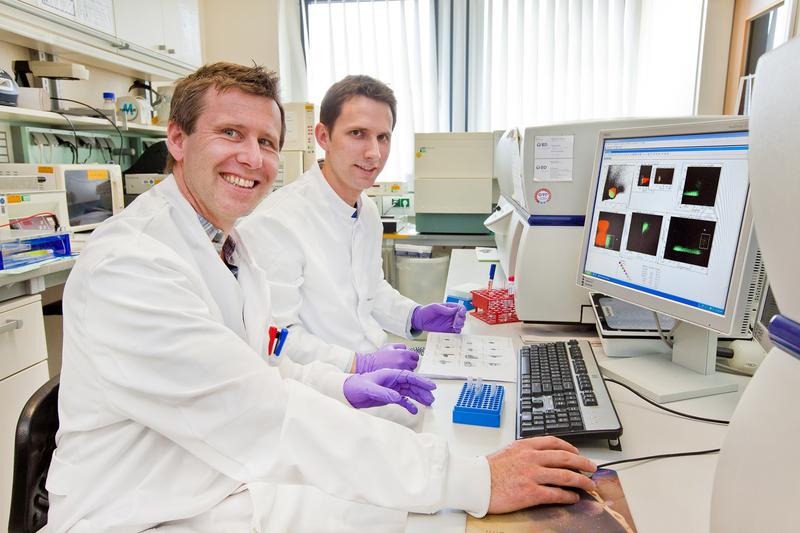 Privatdozent Dr. Immo Prinz (vorne) und Dr. Jan Haas am Durchfluszytometer. Quelle: (idw)