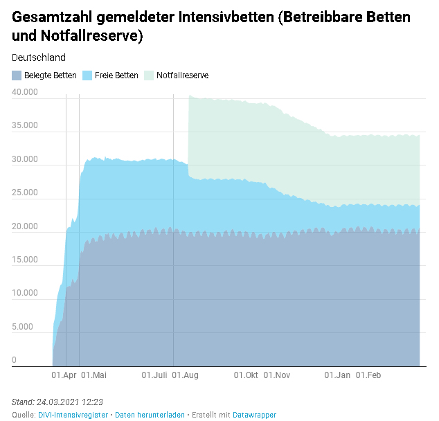 Intensivbettenbelegung: Auffällig ist, daß die Zahl der freien Betten dramatisch sinkt, während die Belegung und die Notreserve praktisch konstant bleiben. Warum werden Intensivbetten abgebaut? Stand 24.03.2021