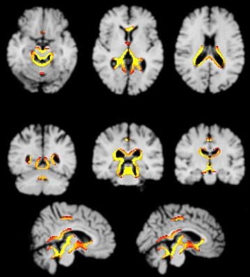 MR-Schnitte durch das Gehirn einer 49jährigen Frau, die seit zehn Jahren alkoholabhängig war, beim Beginn ihrer Behandlung. Die alkoholbedingte Hirnschrumpfung ist an erweiterten Hirnwasserkammern und -furchen erkennbar. Mit der Abstinenz gewann das Gehirn der Patientin rund drei Prozent an Volumen. Farbig hervorgehoben sind die Bereiche, in denen bei der Mehrzahl der 15 untersuchten Patienten eine derartige Hirnregeneration beobachtet wurde. Abbildung: Andreas Bartsch/Georg Homola