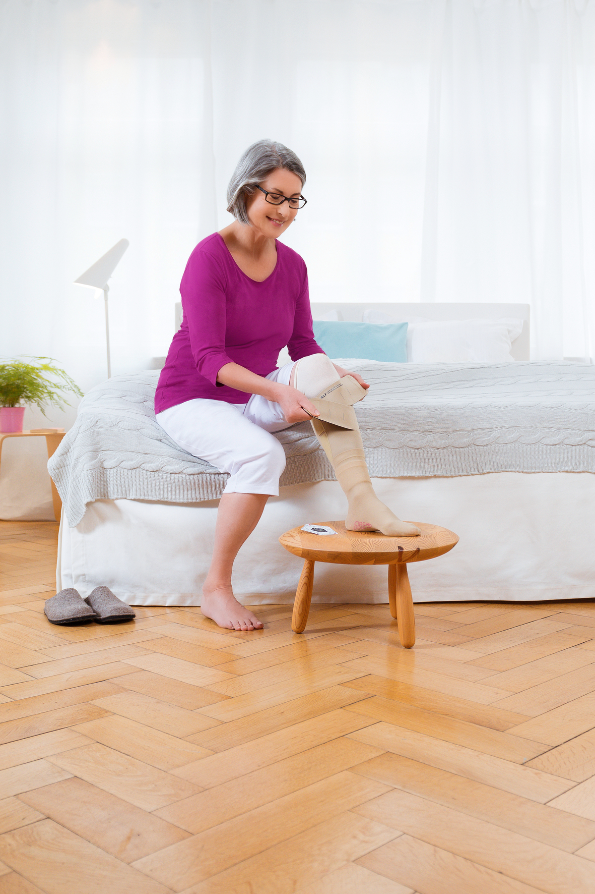 Therapeut in eigener Sache: Nach der individuellen Anpassung und entsprechender Anleitung kann der Patient die Kompressionsversorgung selbstständig anlegen. Bild: "obs/medi GmbH & Co. KG"