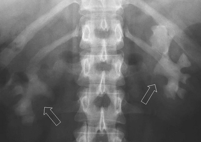 Röntgenaufnahme. Extreme Steinbildung in beiden Nieren. Beide Nierenhohlräume wurden innerhalb eines Jahres nahezu vollständig von Steinmaterial ausgefüllt ("Ausgußsteine"). (c) Urologische Klinik der Uniklinik Bonn