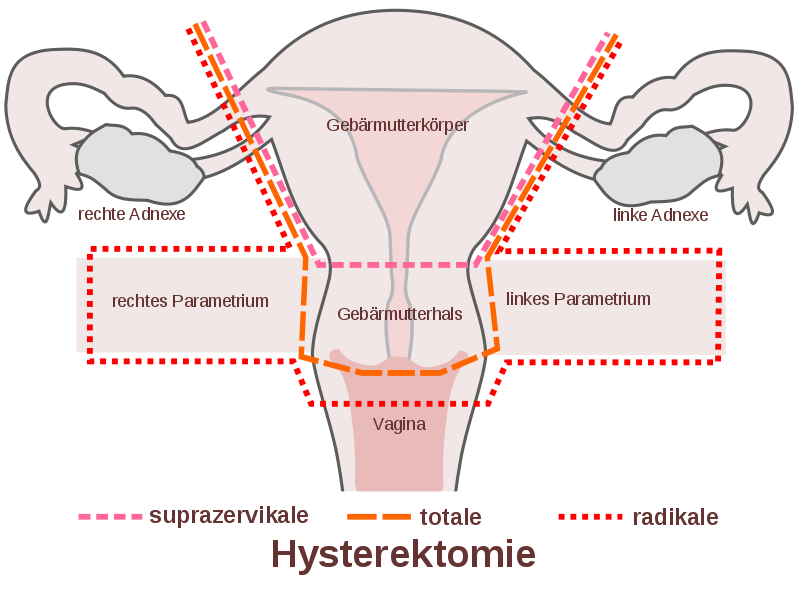Schematische Darstellung der Ausdehnung unterschiedlicher Formen der Hysterektomie