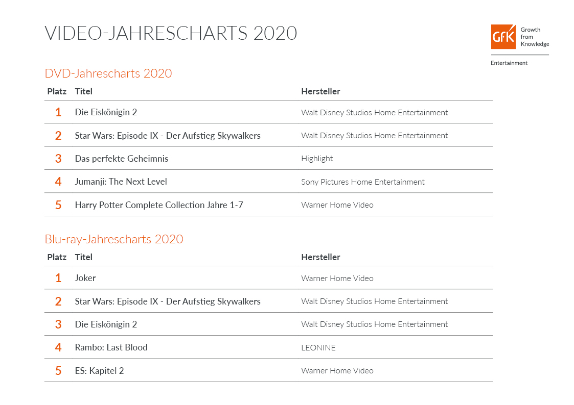 Deutsche Video-Jahrescharts 2020 Bild: "obs/GfK Entertainment GmbH"