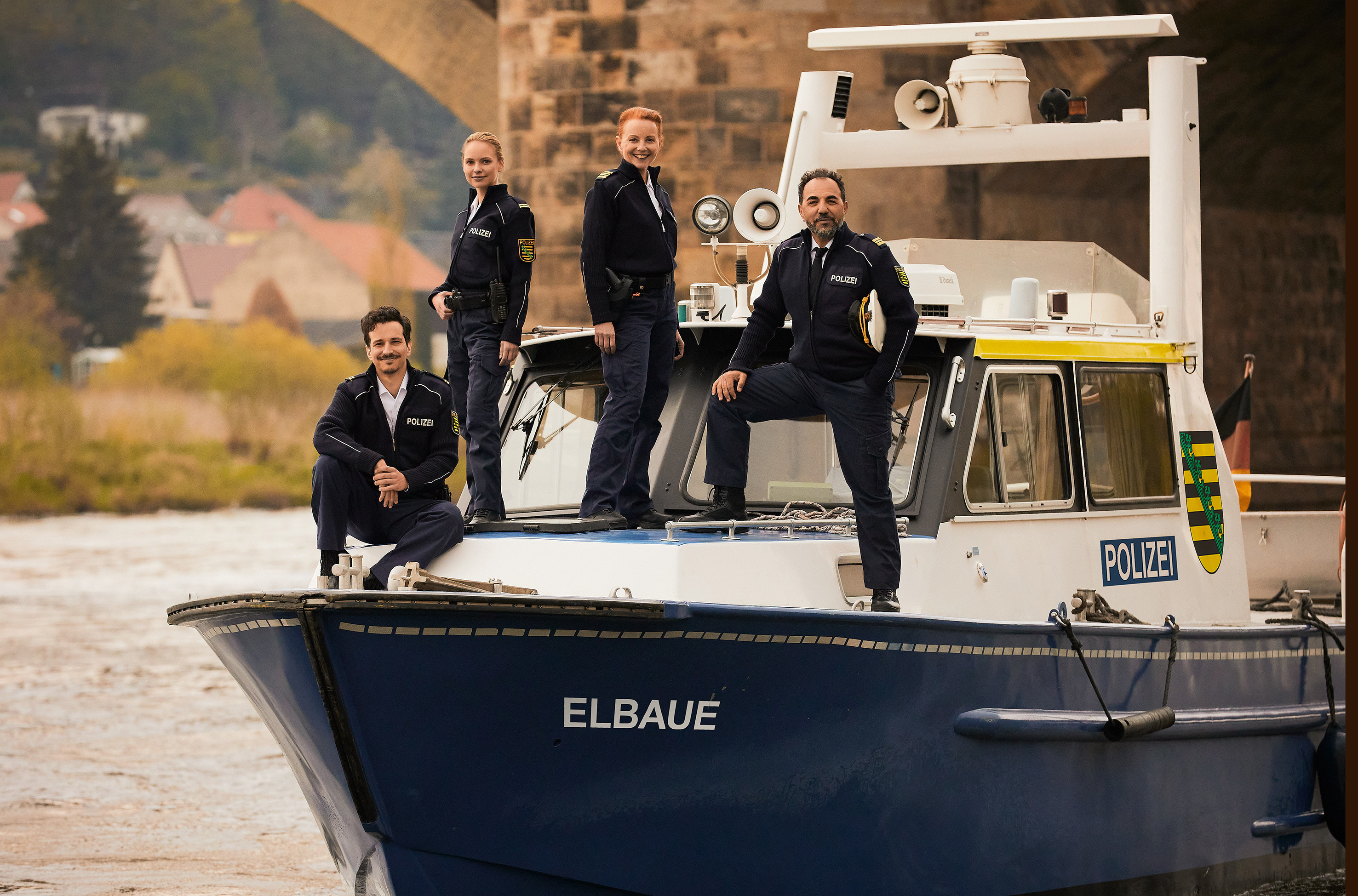 Hauptkommissarin Maike Junghans (Carina Wiese, 2.v.r.), die Kommissar:innen Jana Macourek (Barbara Prakopenka, 2.v.l.) und Moritz Kretschmär (Ferdi Özten, l.) sowie der universalbegabte Allrounder Sami Fares (Adnan Maral, r.) sind die Neuen bei der Wasserschutzpolizei an der Elbe. Bild: ARD/Rudolf Wernicke Fotograf: ARD Das Erste