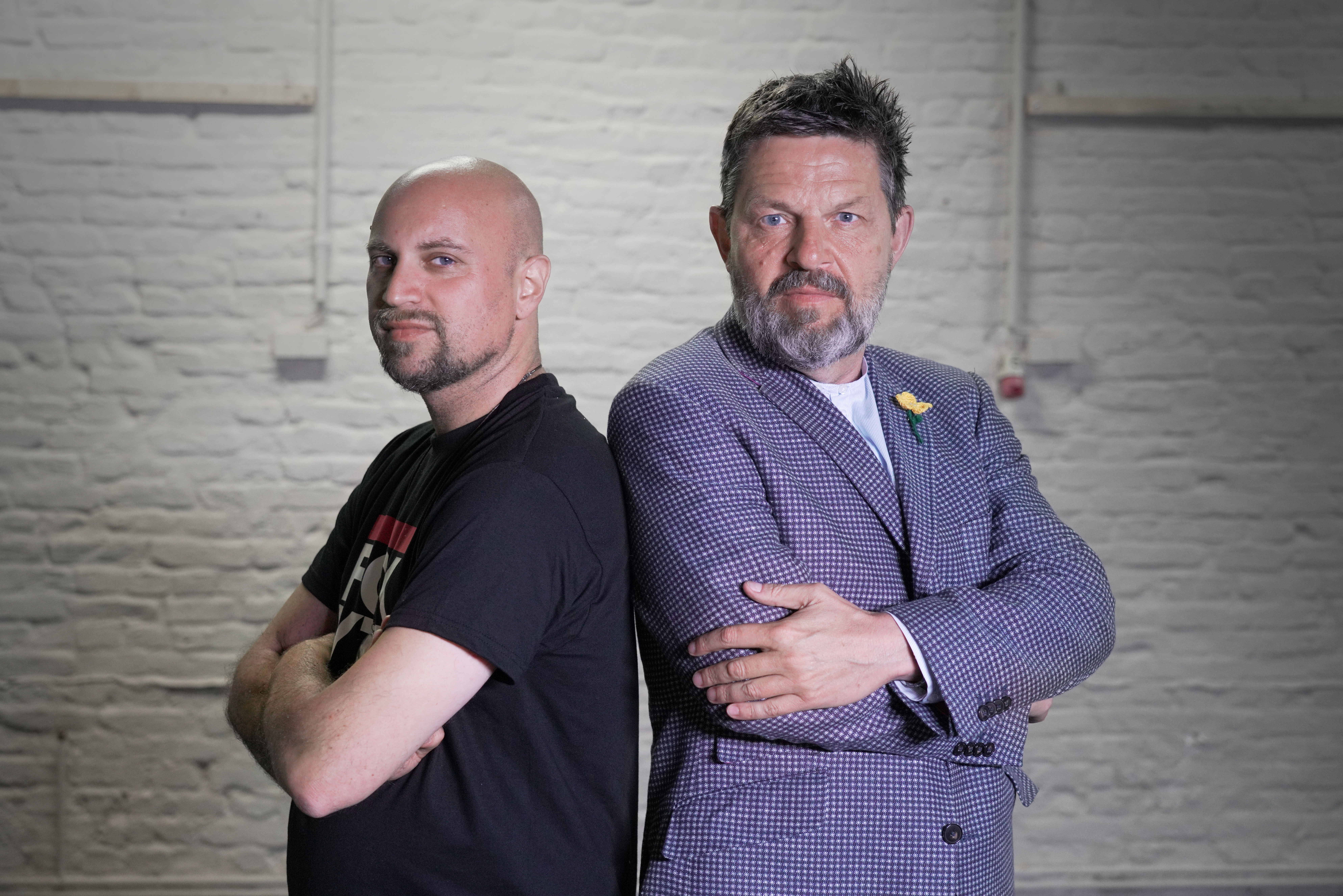 Künstler Willy Karma (l.) und TELE 5-Senderchef Kai Blasberg (r.) zelebrieren gemeinsam den Ausstieg bei Youtube. Bild: "obs/Tele 5/TELE 5"