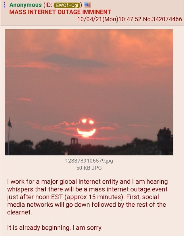 Zurück zu Globaler Ausfall der Onlinedienste wurde eine Viertelstunde vor Beginn auf 4chan angekündigt