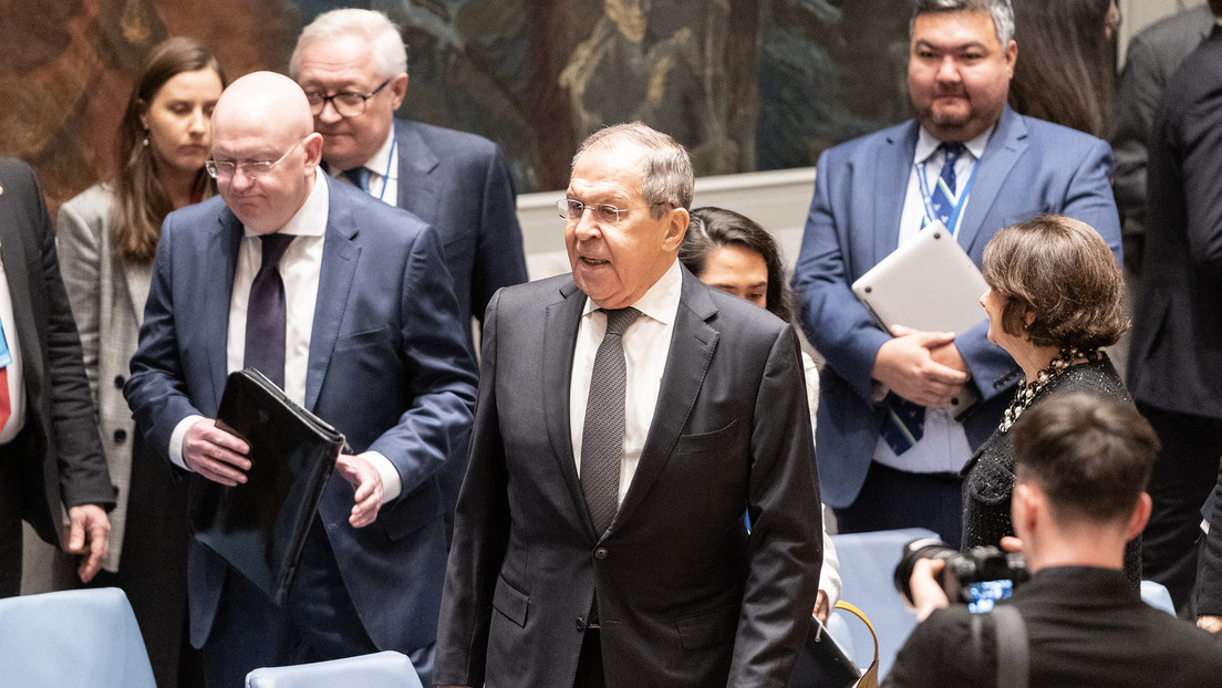 Der russische Außenminister Sergei Lawrow mit der russischen Delegation im UN-Sicherheitsrat (2023) Bild: www.globallookpress.com / Lev Radin