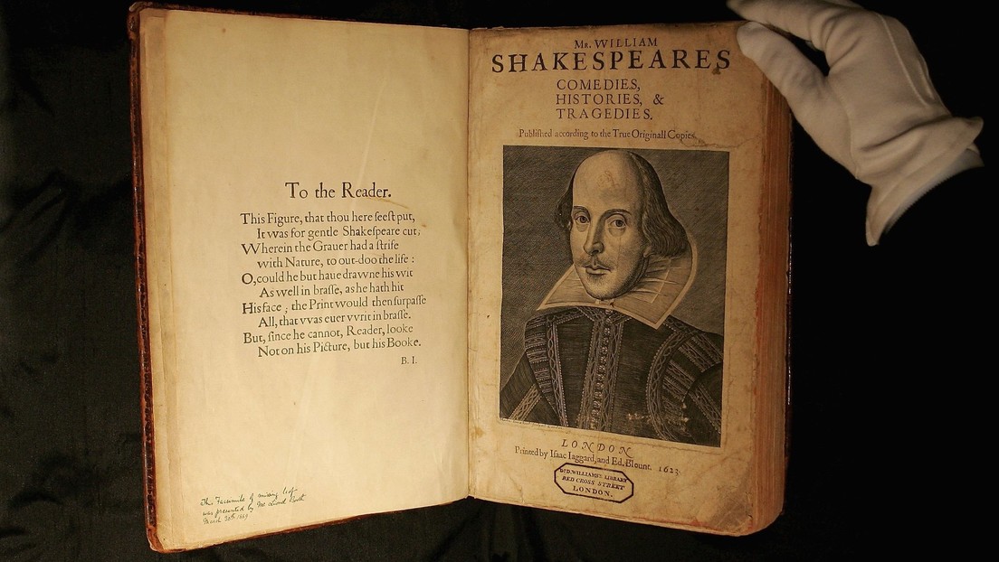 Archivbild: Ein Mitarbeiter von Sotheby's hält die erste Folio-Ausgabe der Shakespeare-Stücke aus dem Jahr 1623.