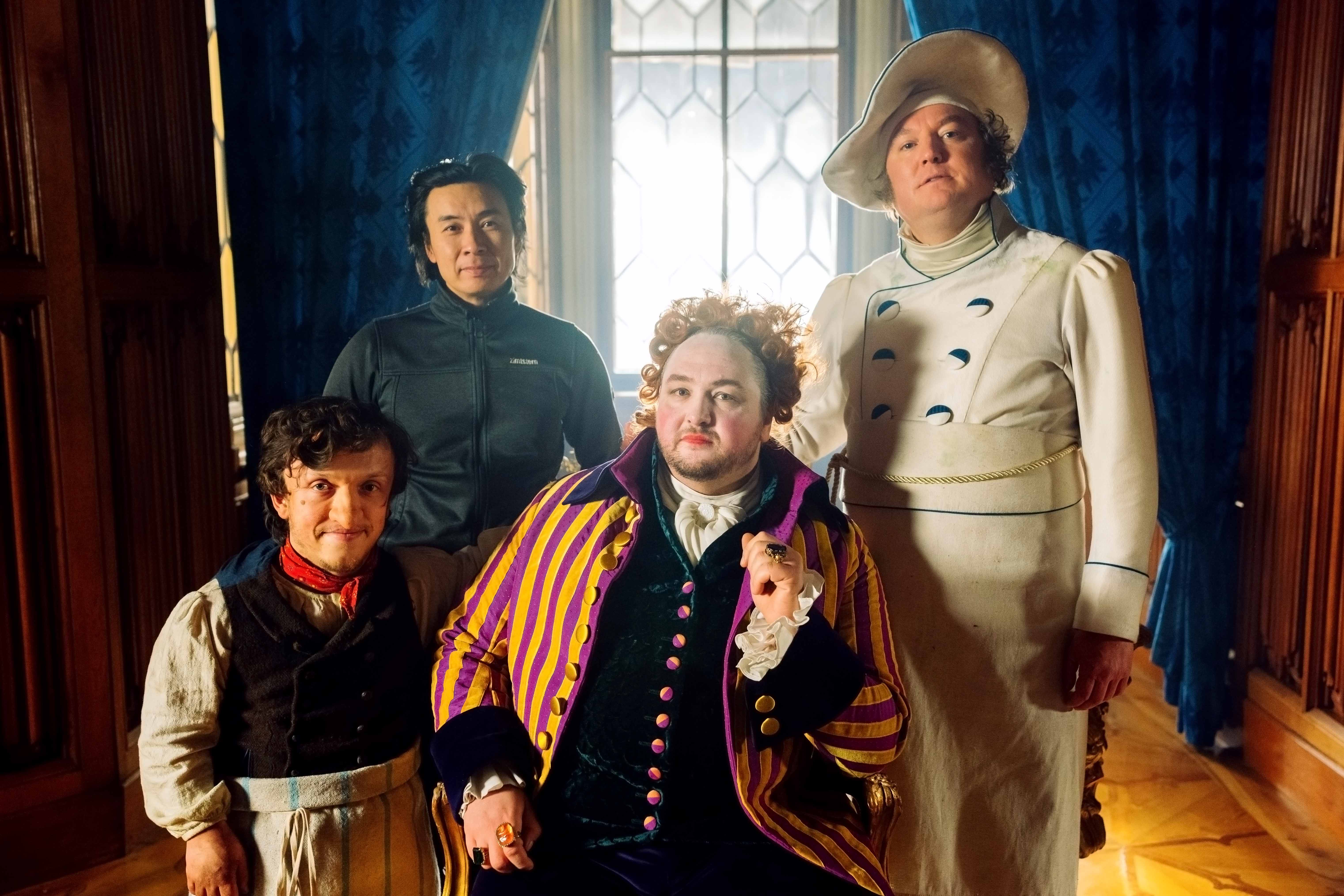 Von links: Zwerg Nase (Mick Mehnert), Regisseur (Ngo The Chau), Herzog Kunz der Schlemmer (Daniel Zillmann) sowie der Oberküchenmeister (Christian Ahlers) / Bild: ZDF Fotograf: Jan Hromadko