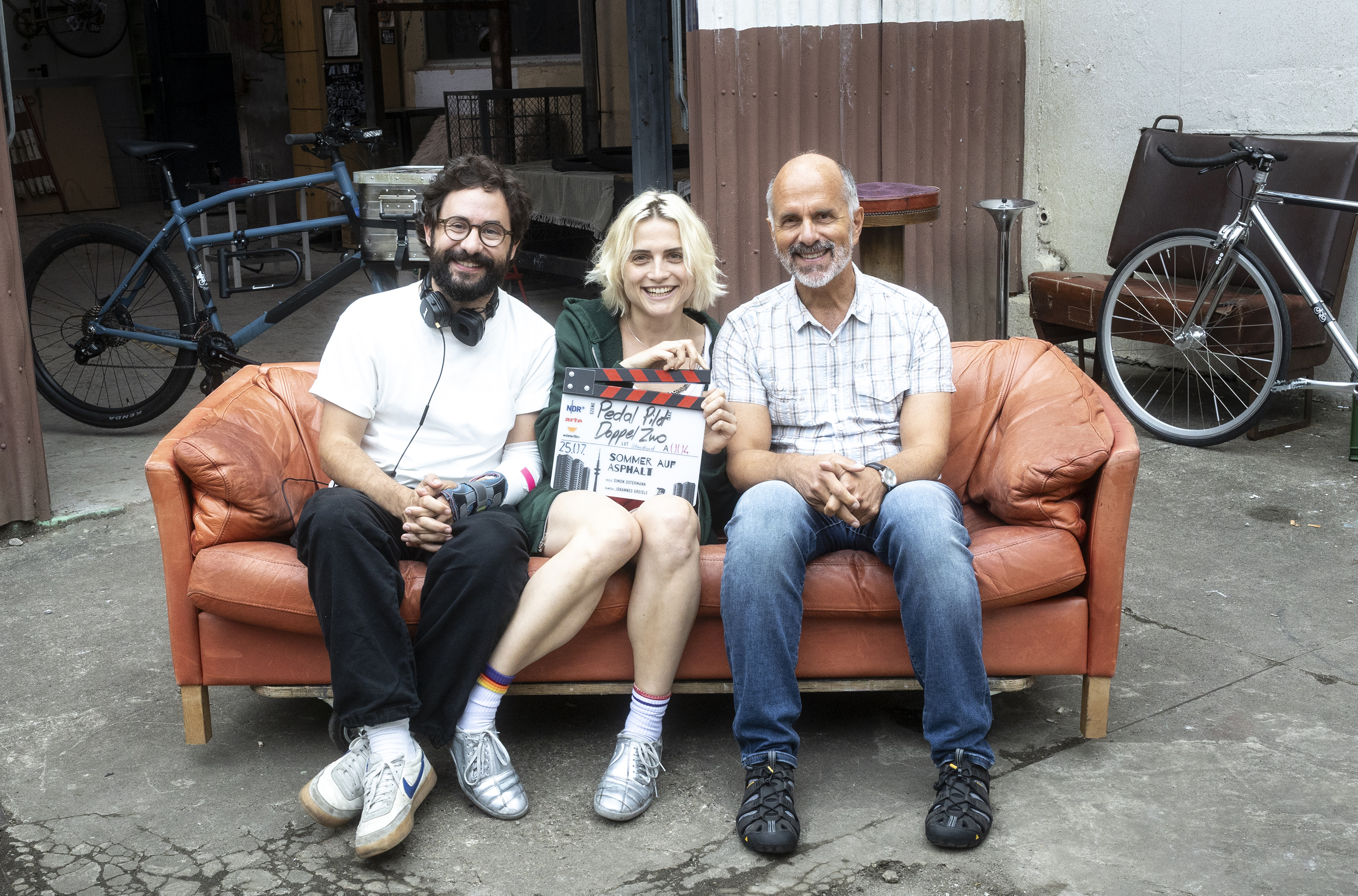 Simon Ostermann (Regie), Mala Emde (Rolle LES) und Christoph Maria Herbst (Rolle BERT, v. l. n. r.). (2025) Bild: NDR/Wüste Medien/Frizzi Kurkhaus Fotograf: NDR Norddeutscher Rundfunk